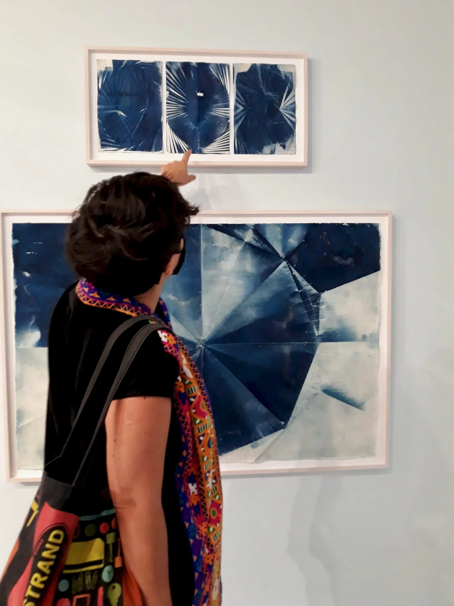 It is difficult to describe Alipour’s works through form alone-- they are at once photography, sculpture, drawing, and print. Maps of intuition informed by Alipour’s mathematical training. Lines are imprinted on toner paper through the additive process of patient gestures, and revealed through the subtractive friction of creases. The paper itself shifts to claim its own space--rises, dips, like rocky planes of shifted land. The heights and furrows cast shadows which interact with the already present subtleties of shade within the variegated blues of the cyanotypes: creating hypnotic, undulating bodies, holding a trajectory of the touch of sun’s light on each plane.